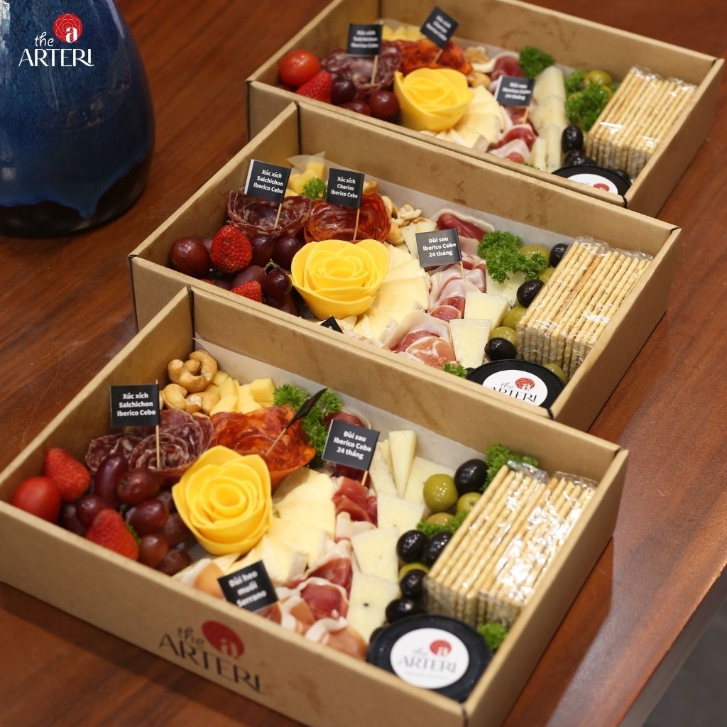 Các set charcuterie gồm thịt muối, xúc xích, phô mai, bánh cracker, trái cây,...