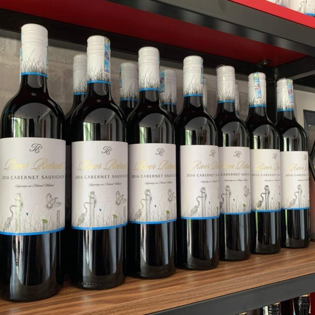 Rượu vang đỏ River Retreat Cabernet Sauvignon 2016 được trưng bày trên kệ, thiết kế nhãn trắng sang trọng, phù hợp làm quà tặng hoặc dùng trong tiệc.