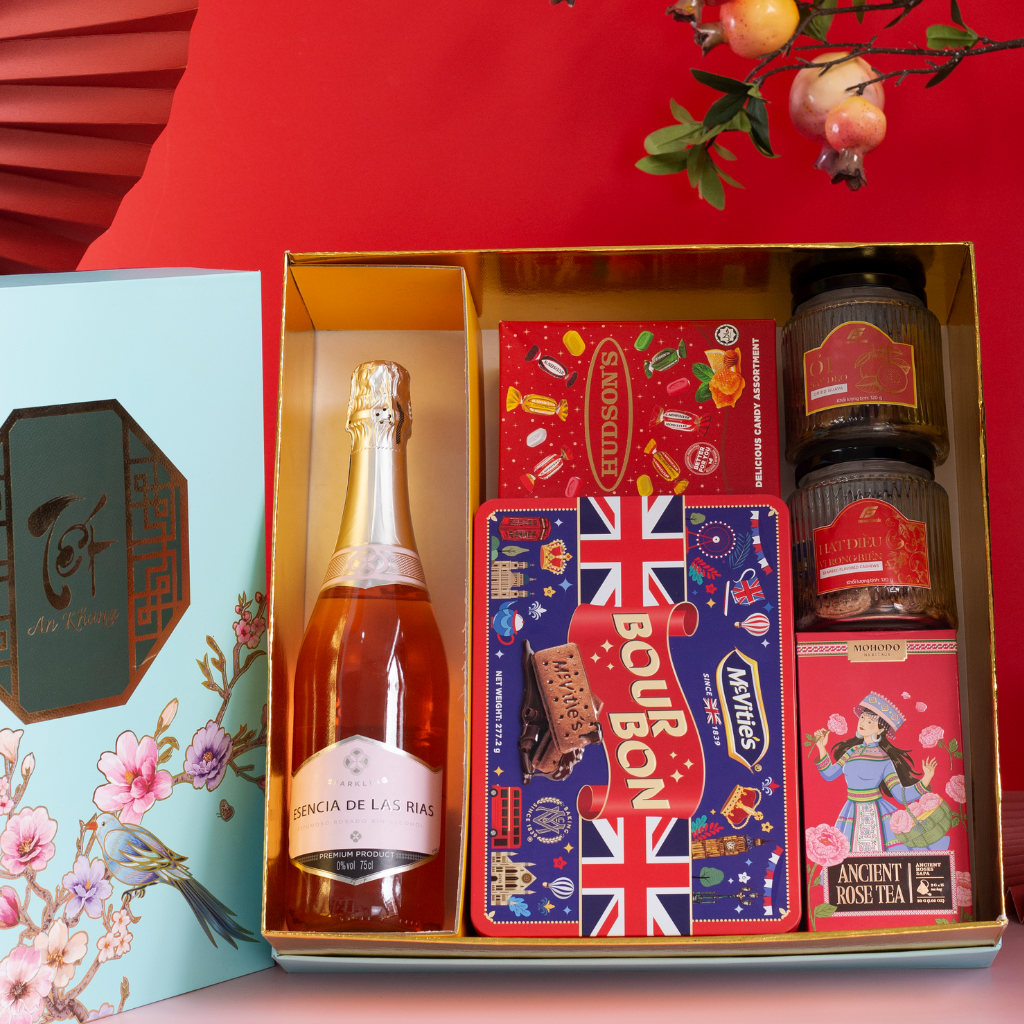 Hộp quà Tết sang trọng gồm vang nổ hồng Esencia De Las Rias, bánh kẹo Âu và trà hoa hồng, được bày trí trong hộp tinh tế và sang trọng.