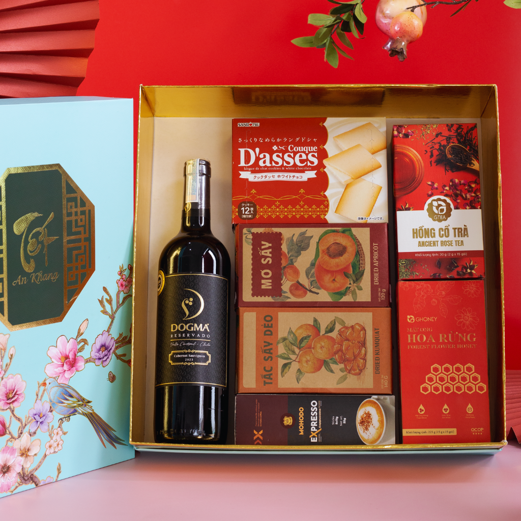 Set quà Tết cao cấp chứa rượu vang DOGMA cùng bánh quy D’asses, mơ sấy, tắc sấy dẻo, trà hoa và mật ong hoa rừng, thiết kế hộp mang họa tiết Tết Việt.