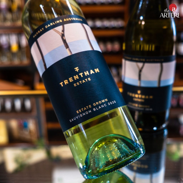 Rượu vang trắng Trentham Estate Sauvignon Blanc 2020 với thiết kế nhãn xanh tinh tế, hương vị tươi mát, thích hợp làm quà tặng hoặc thưởng thức trong các bữa tiệc nhẹ.
