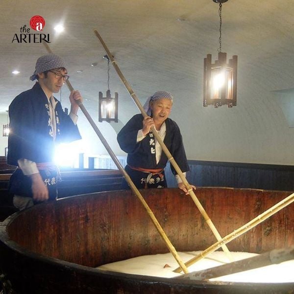 Nghệ nhân Daishichi khuấy men thủ công theo phương pháp Kimoto