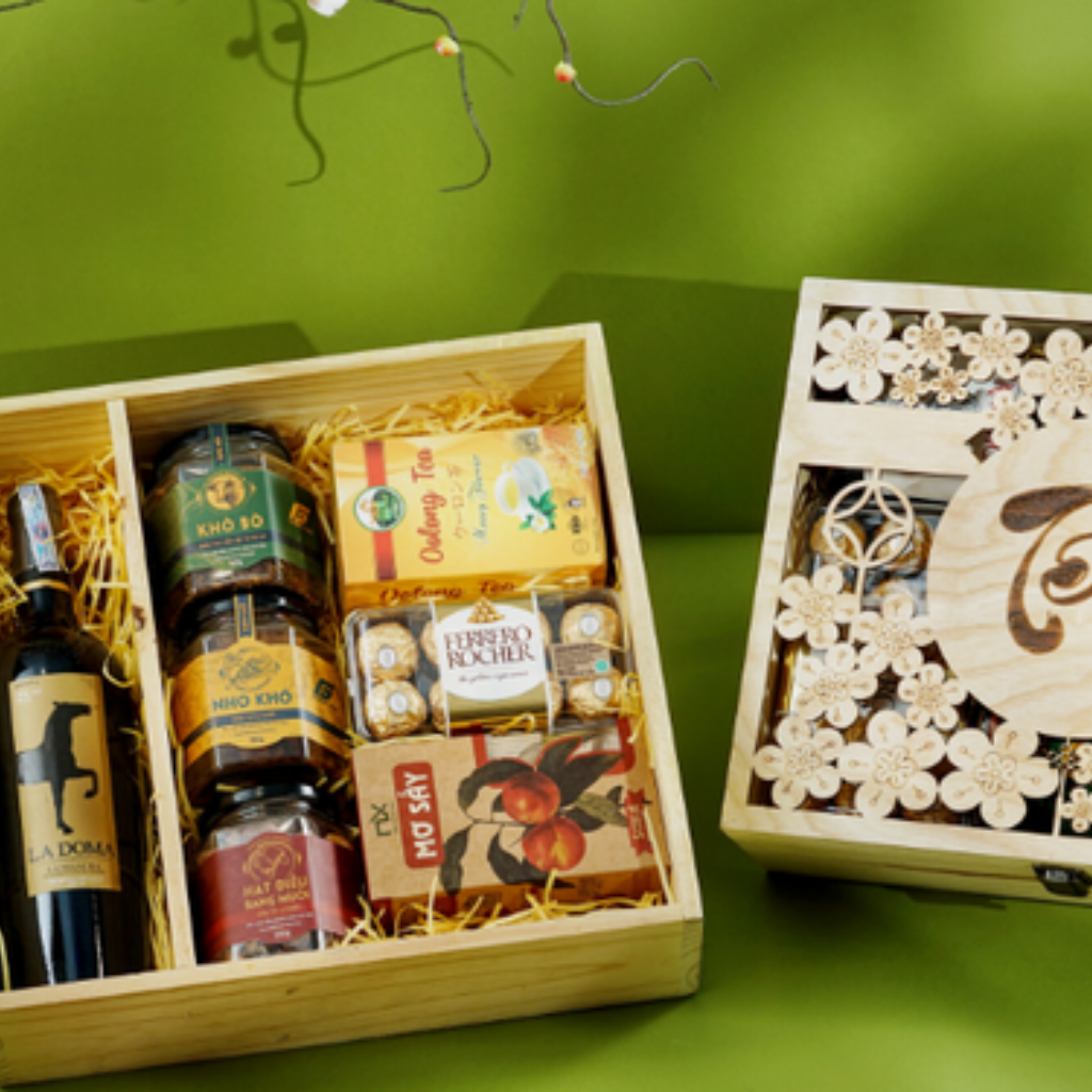 Hộp quà Tết gỗ chạm hoa kèm rượu vang, khô bò, hạt điều, trà và chocolate, giỏ quà sum vầy sang trọng cho gia đình và doanh nghiệp.