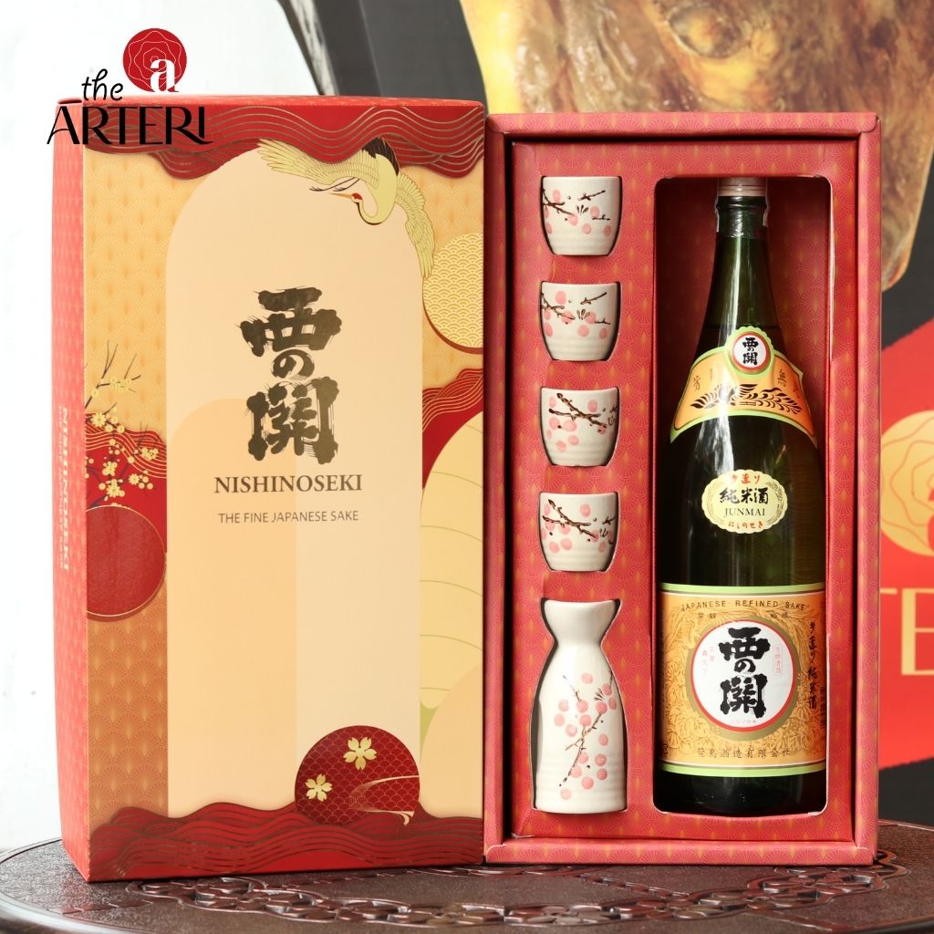 Set quà Nishinoseki Junmai kèm bình–chén: sake thanh êm, hậu ấm dịu; hộp đỏ sang trọng cho dịp Tết.