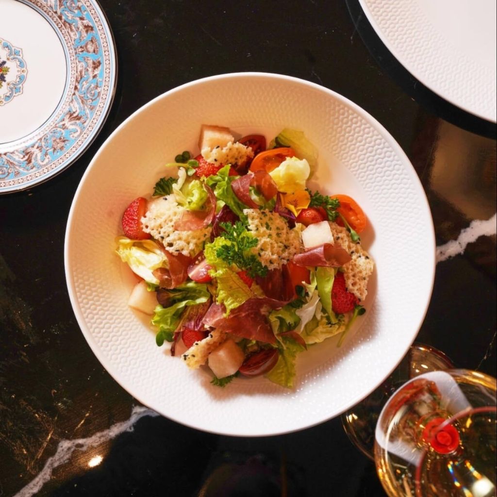 Salad dưa lưới và jamon Iberico cuộn hoa rắc tiêu cùng rau thơm vị ngọt mát cân bằng béo mặn.