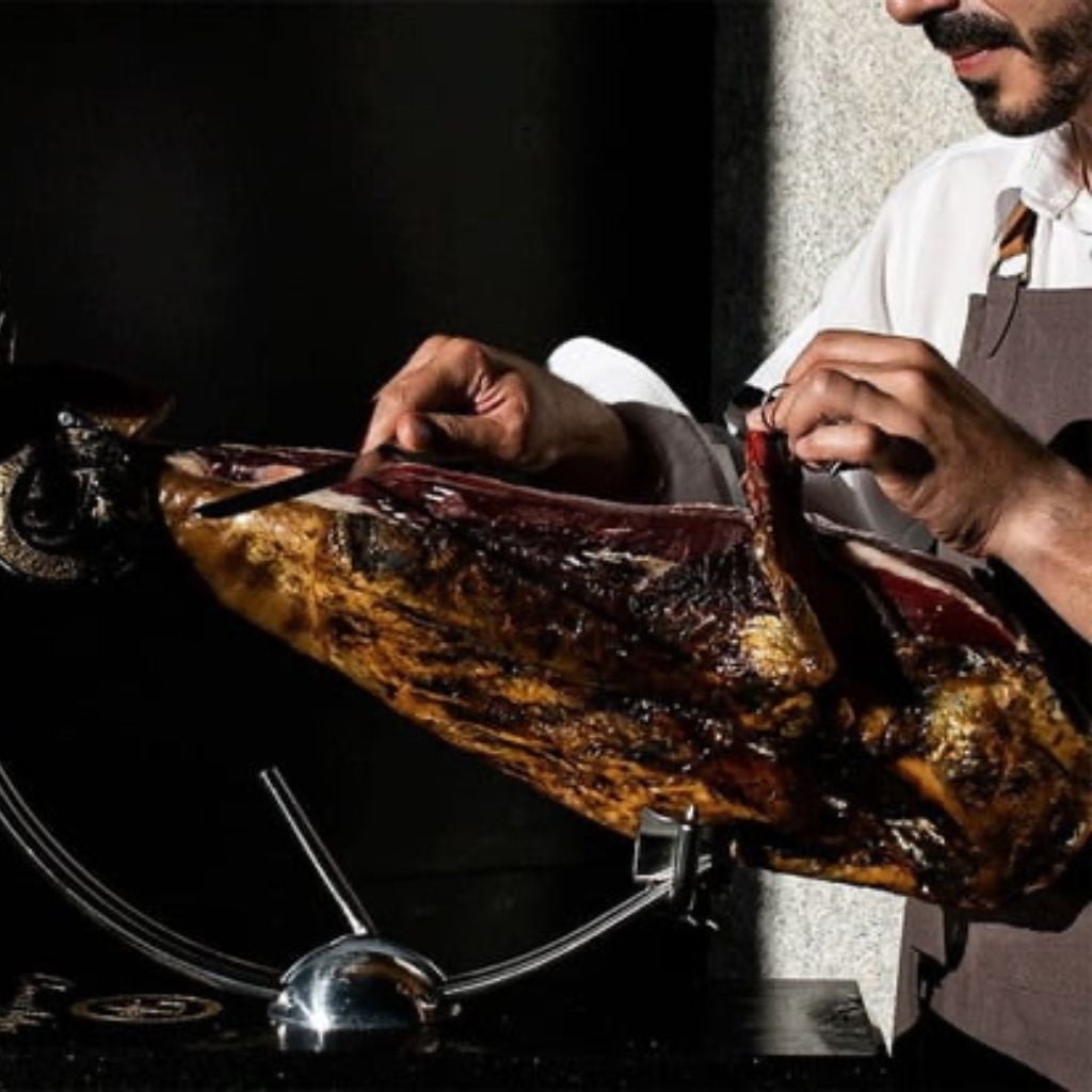 Đầu bếp đang tỉa gọt đùi Jamón Ibérico trên giá và cắt từng lát để phục vụ.