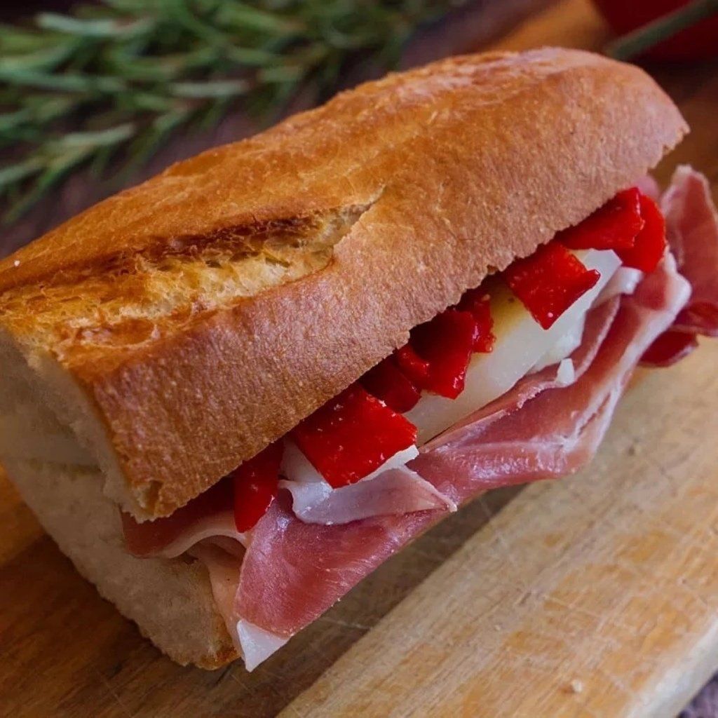 Một chiếc bánh mì kẹp (bocadillo) tươi ngon với những lát Jamón Serrano de Bodega.
