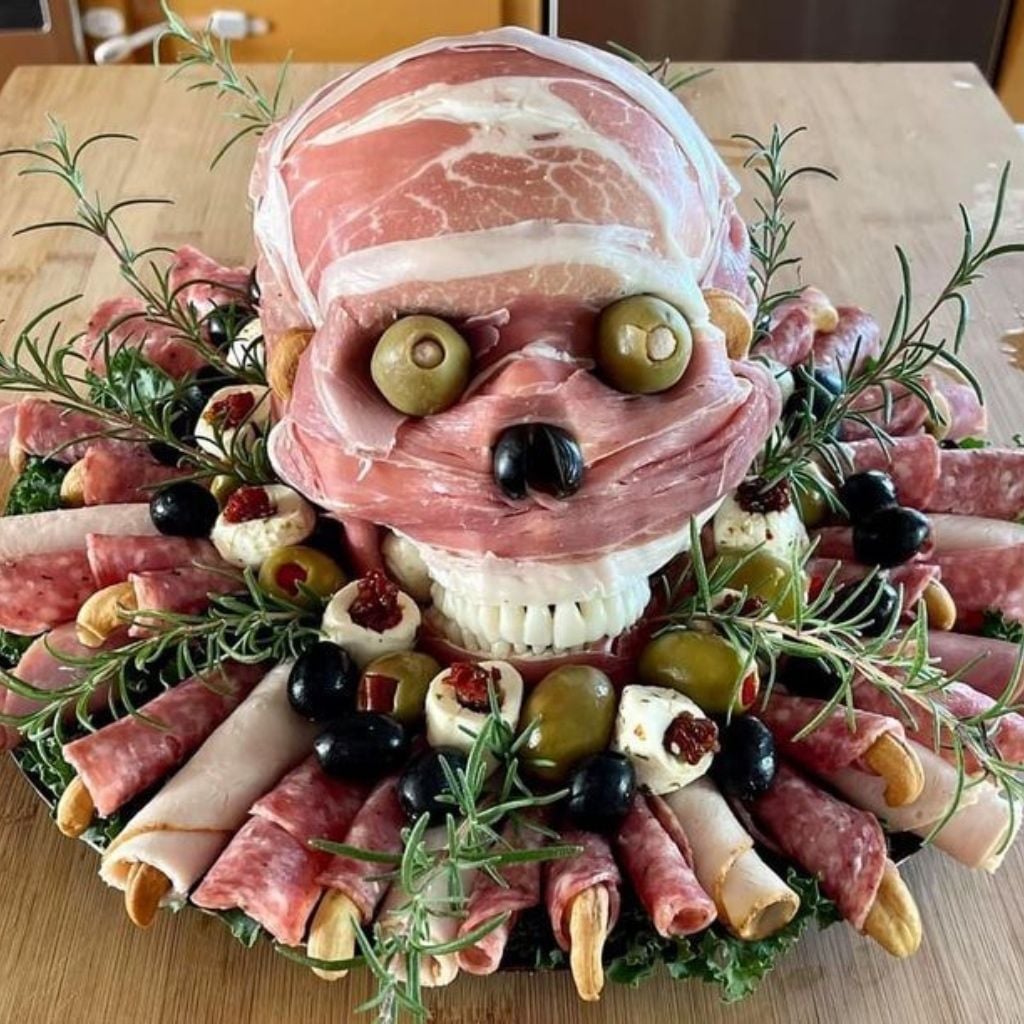 Mâm charcuterie Halloween sang trọng: đầu lâu bọc đùi heo muối, mắt ô liu, kèm cuộn thịt nguội, phô mai - tâm điểm bàn tiệc.