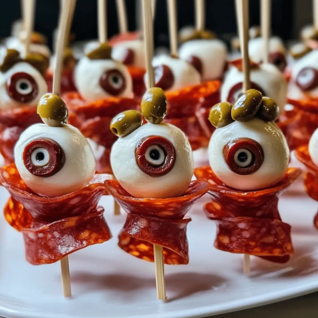 Khai vị Halloween ‘mắt quỷ’: phô mai mozzarella và ô liu cắm xiên, đặt trên lát đùi heo muối; món nhâm nhi lý tưởng cùng rượu vang.