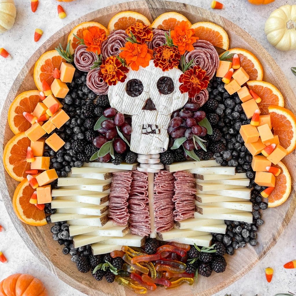 Khay charcuterie hình bộ xương cho tiệc Halloween: đầu lâu từ phô mai, phần thân xếp salami và đùi heo muối, điểm cam lát, nho đen và dâu rừng.