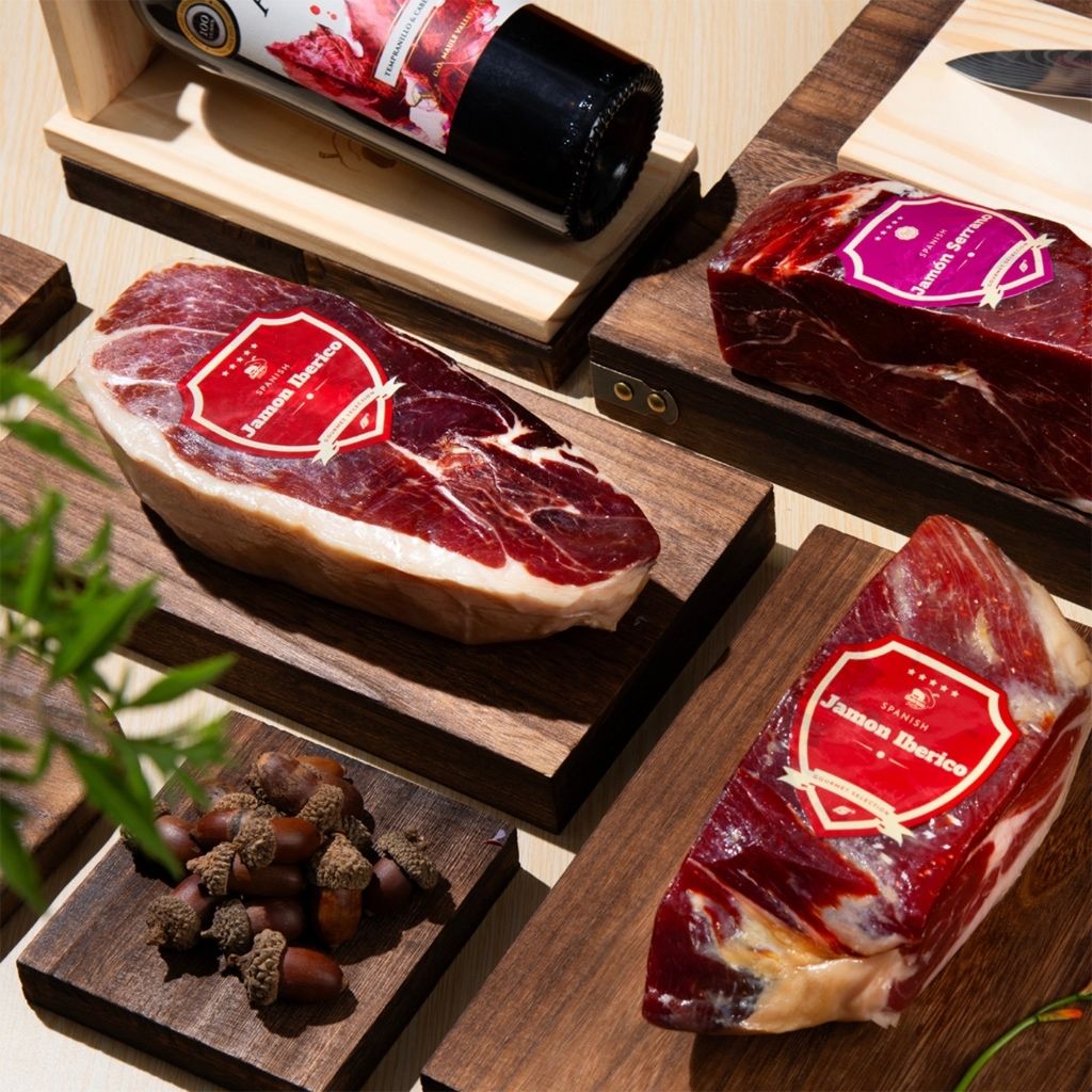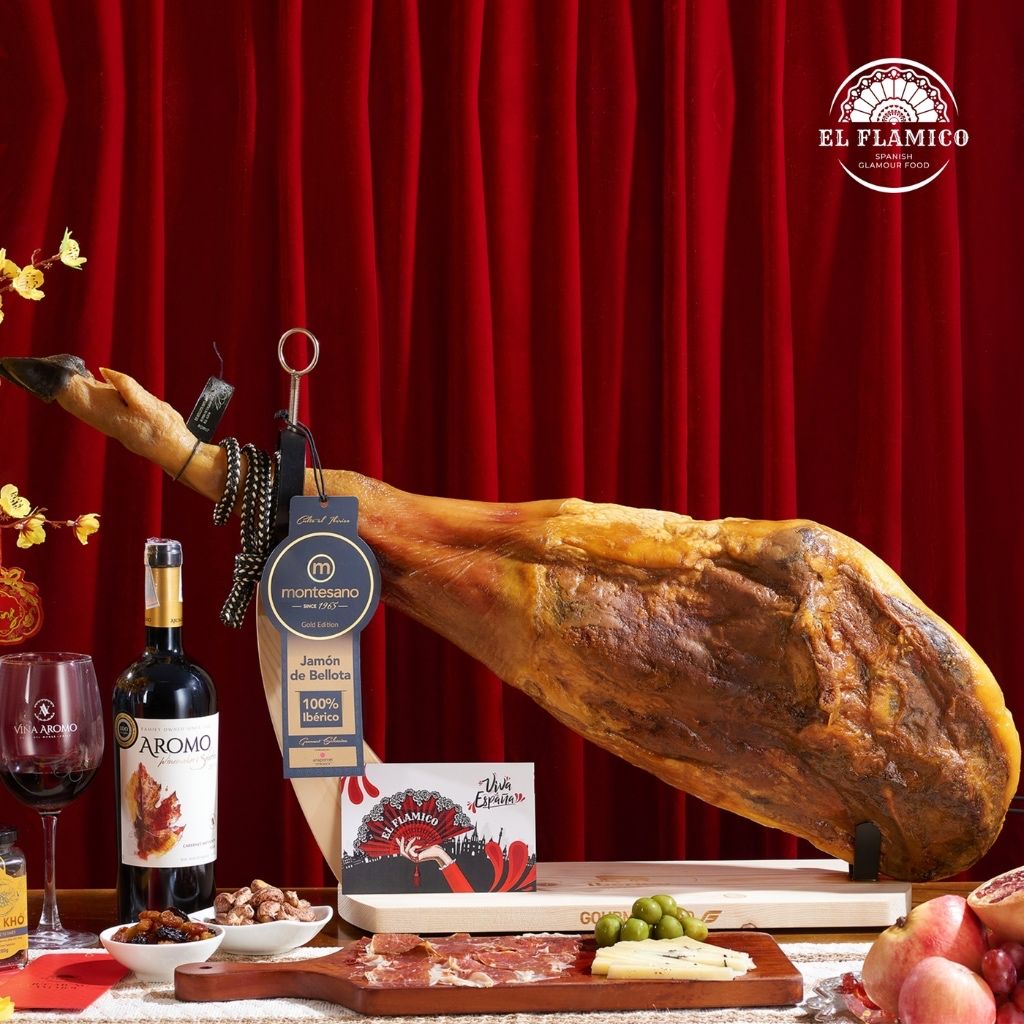Set quà Tết vinh danh đẳng cấp: Đùi heo muối Iberico nguyên chiếc cao cấp trên giá đỡ, cùng rượu vang và hộp quà hoàng gia sang trọng bậc nhất.