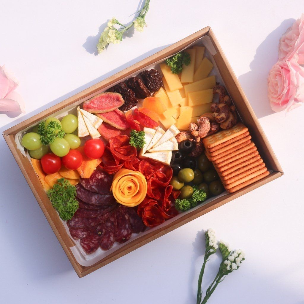 Set quà kết nối: đùi heo muối thái lát kèm oliu phô mai và bánh quy gọn gàng tinh tế cho lời chúc đầu năm.