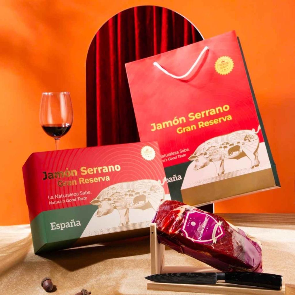 Đây là lựa chọn "át chủ bài" để tạo nên sự khác biệt. Một set quà với ngôi sao là đùi heo muối Iberico (dù là đùi nguyên chiếc, khối rút xương hay các pack thái lát sẵn) luôn mang đến trải nghiệm ẩm thực đỉnh cao. Kết hợp cùng các loại thịt nguội Tapas, phô mai và ô liu, món quà này sẽ trở thành tâm điểm của mọi bàn tiệc ngày Tết.