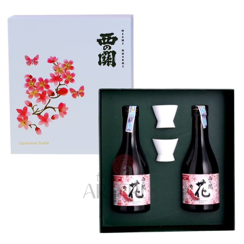 Mỗi hộp quà bao gồm hai chai Sake Nishino Seki Hana 300ml và hai ly uống Sake chuyên dụng, tạo nên trải nghiệm thưởng thức trọn vẹn và tinh tế ngay tại nhà.